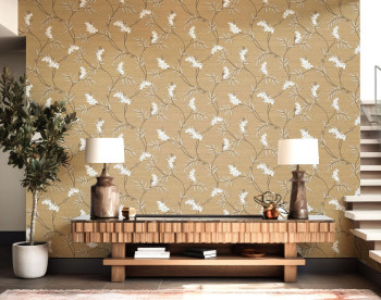 Luxusní hnědá vliesová tapeta s vinylovým povrchem, efekt jemné textilie s rozkvetlými větvičkami v odstínech hnědo-zlaté a bílé.
