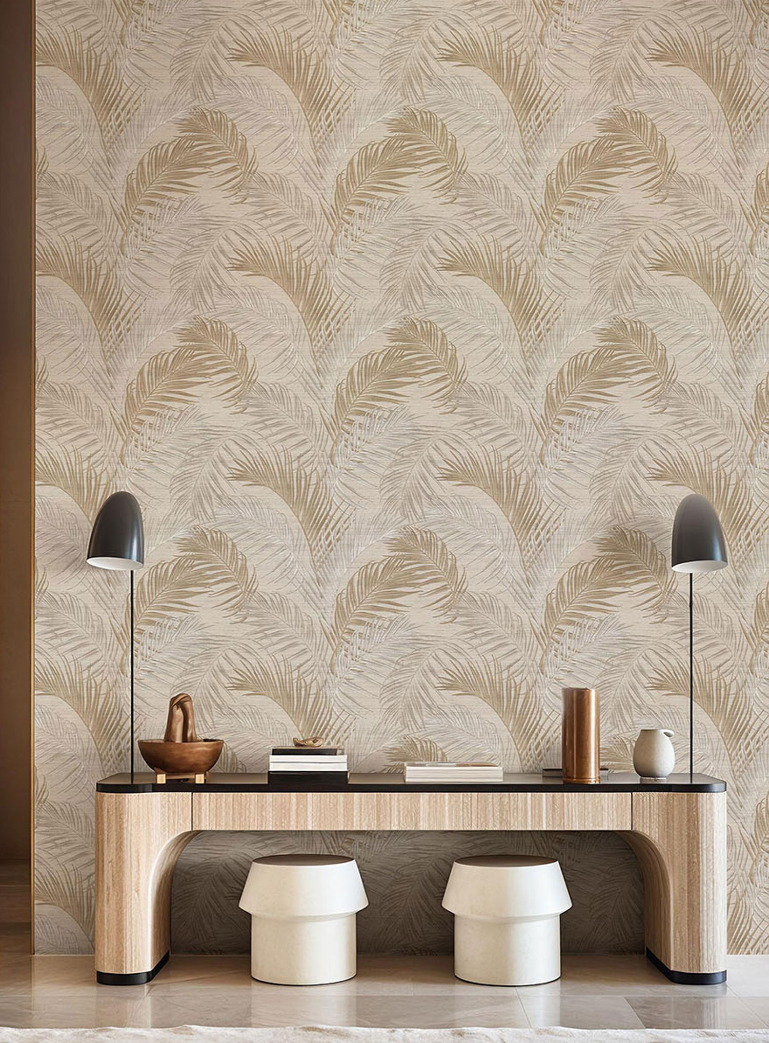 Luxusní vliesová tapeta s vinylovým povrchem, plastické motivy palmových listů, odstíny zlaté a metalické šedo-béžové.
