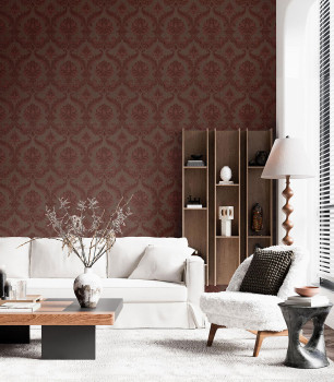 Luxusní terakotová vliesová tapeta s vinylovým povrchem, jemně plastický zámecký damaškový vzor v odstínech metalické vínové.