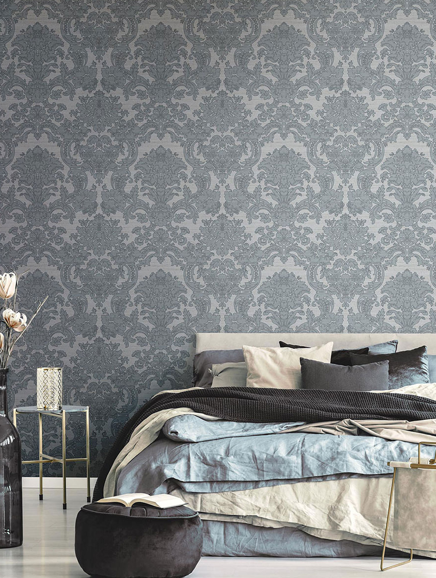 Luxusní šedo-modrá vliesová tapeta s vinylovým povrchem, jemně plastický zámecký damaškový vzor.