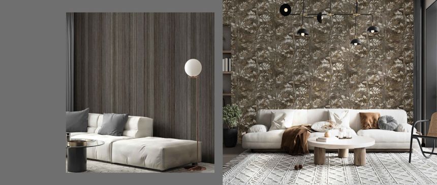 Luxusní plastická vliesová tapeta s vinylovým povrchem, motivy větviček a listů v odstínech hnědé.