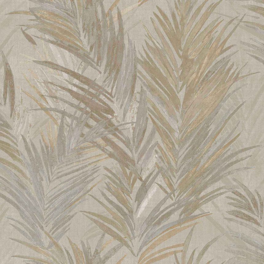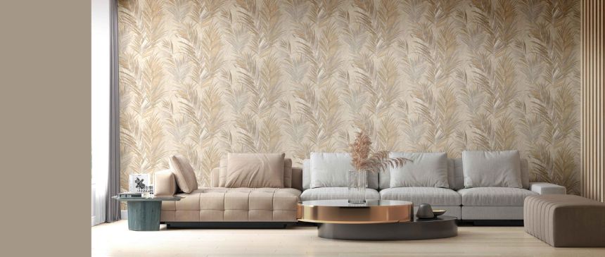 Luxusní plastická béžová vliesová tapeta s vinylovým povrchem, motivy větviček a listů v odstínech hnědé, šedo-béžové a zlato-stříbrné; hrubší textura.