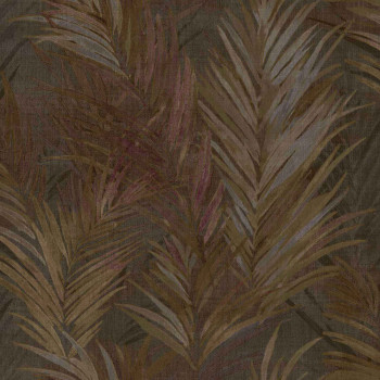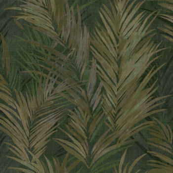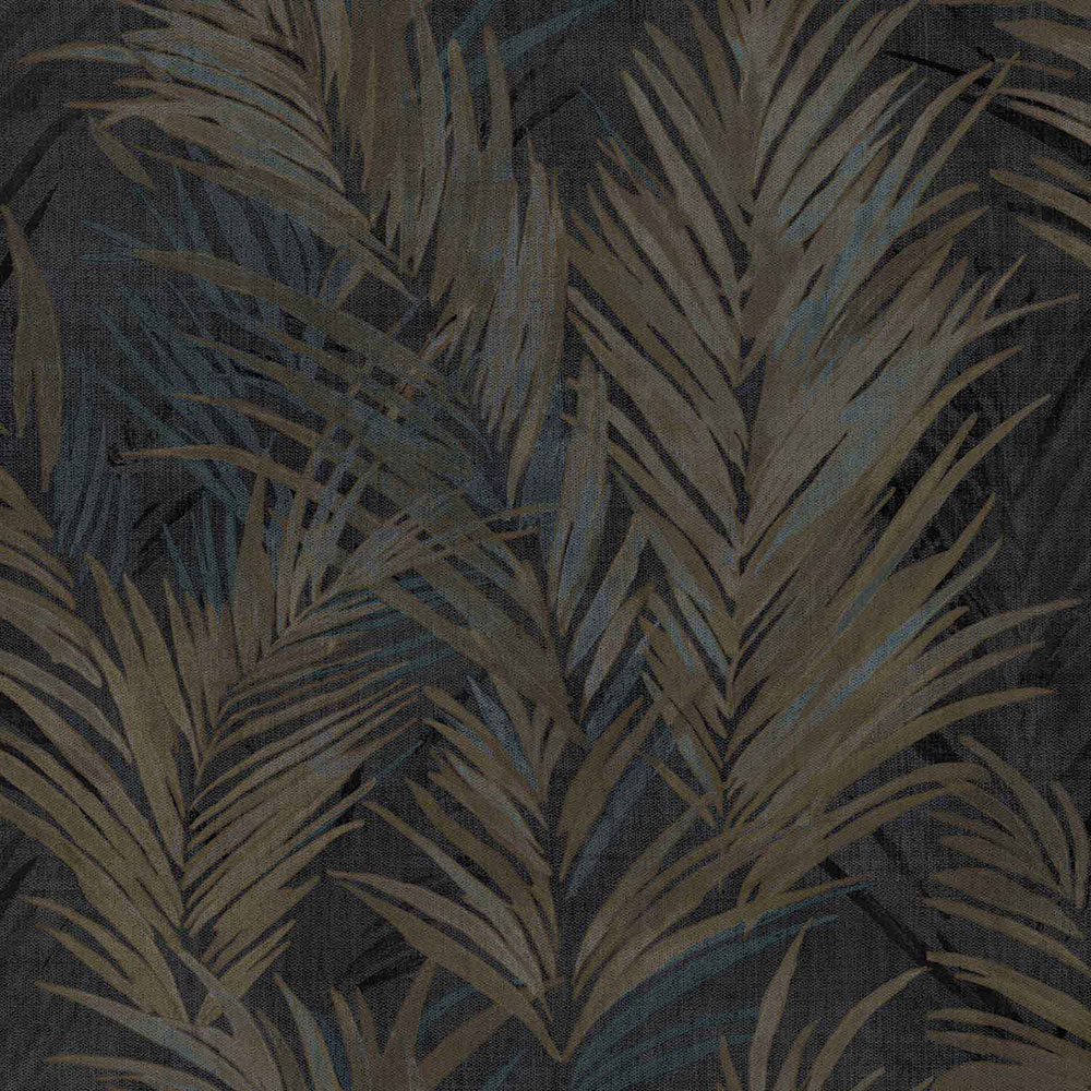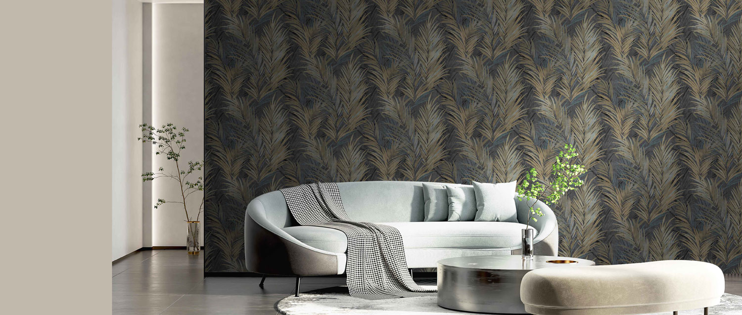 Luxusní plastická černá vliesová tapeta s vinylovým povrchem, motivy větviček a listů v odstínech šedé, pololesklé zlaté a bronzové; hrubší textura.