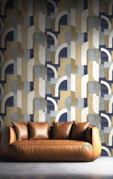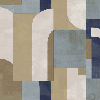 Luxusní plastická vliesová tapeta s vinylovým povrchem, geometrický vzor v odstínech hnědé, béžové, krémové, modré a šedo-modré; hrubší textura.