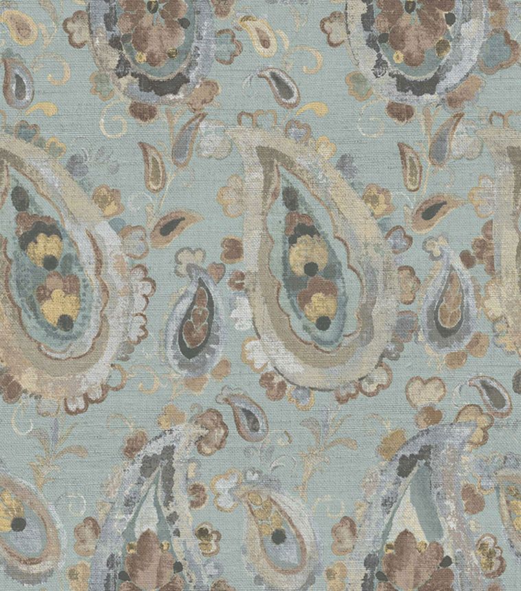 Vliesová tapeta s vinylovým povrchem, vzory evokující gobelíny, odstíny tyrkysové, látková textura.