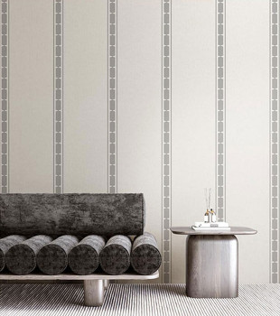 Krémová vliesová tapeta s vinylovým povrchem, okrové zdobené pruhy, látková textura.