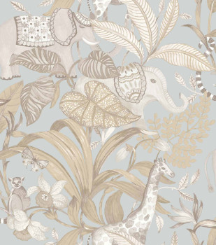 Modrá vliesová tapeta na zeď, motivy zvířátek z Afriky a rostlin.