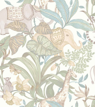 Bílá vliesová tapeta na zeď, motivy zvířátek z Afriky a rostlin.