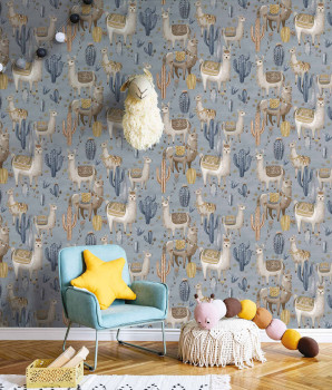 Hnědá vliesová tapeta na zeď, motivy lam a kaktusů.