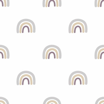 Bílá vliesová tapeta na zeď, duha v odstínech šedé, temně fialové a zlato- béžové.