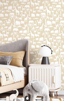 Béžová vliesová tapeta na zeď, bílé siluety zvířátek z Afriky a palem.