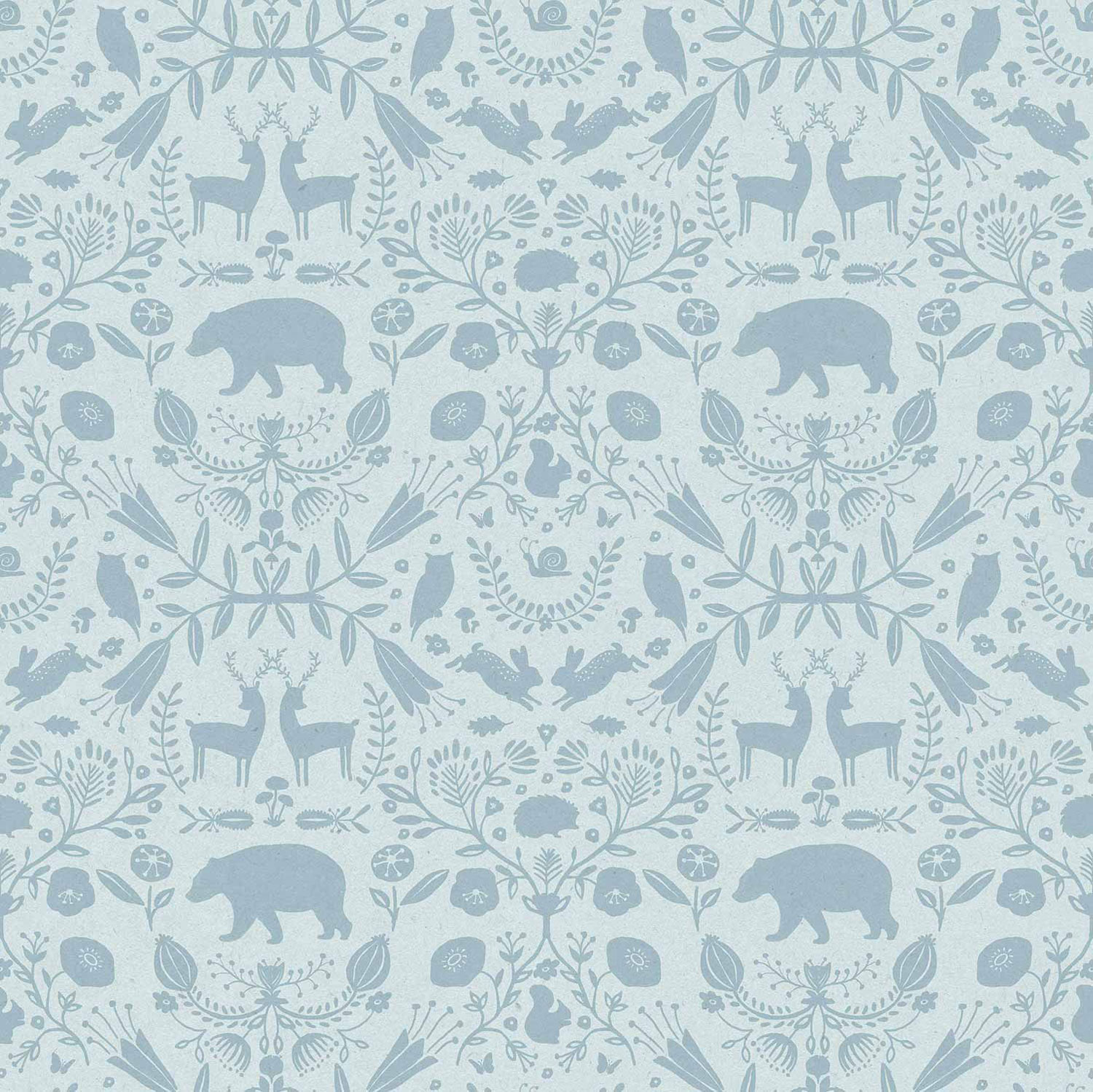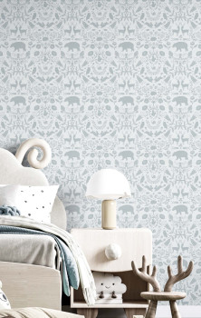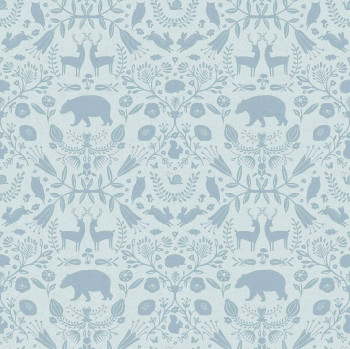 Modrá vliesová tapeta na zeď, motivy zvířátek a květin.