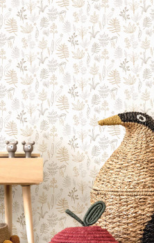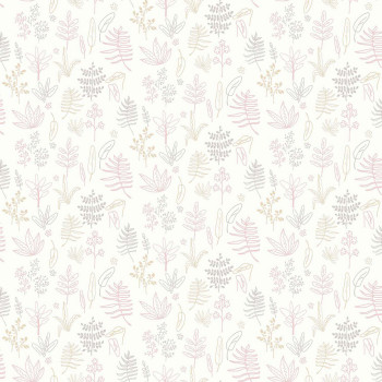 Bílá vliesová tapeta na zeď, listy a rostliny v odstínech růžové, šedé a zlato-béžové.