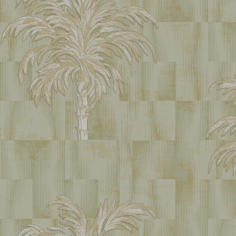 Luxusní zelená vliesová tapeta s vinylovým povrchem, hrubší proužková textura, motiv palem.