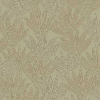 Jemně strukturovaná vliesová tapeta na zeď, odstíny zelené a hnědé, na listech zlaté a stříbřité linie.