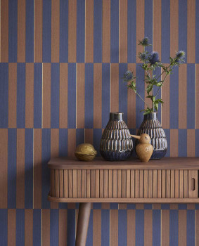 Jemně plastická pruhovaná vliesová tapeta v retro stylu, odstíny modré a hnědé, místy béžové linie.