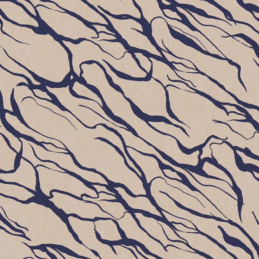 Béžová vliesová tapeta na zeď, modrý žíhaný vzor.