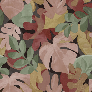 Vliesová tapeta na zeď, motivy listů, odstíny růžové, vínové, zelené a okrové na šedo-černém podkladu.