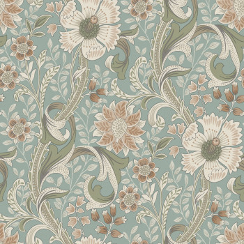 Vliesová tapeta na zeď, ornamentální květinový vzor, odstíny tyrkysové, zelené, hnědé, krémové.