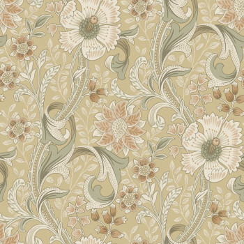 Vliesová tapeta na zeď, ornamentální květinový vzor, odstíny okrové, zelené, hnědé, krémové.