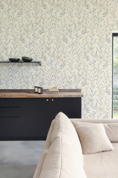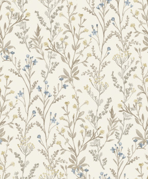 Vliesová tapeta na zeď, vzor lučních květin, odstíny hnědo-šedé, okrové a modré, bílý podklad.