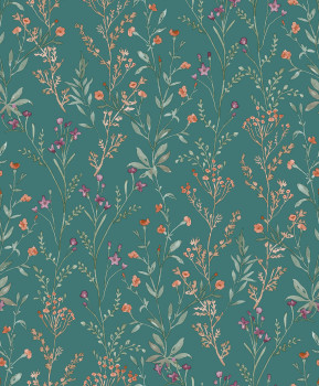 Vliesová tapeta na zeď, vzor lučních květin, odstíny zelené, hnědé, fialové a cihlové, tyrkysový podklad.