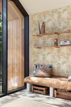 Vliesová tapeta na zeď, geometrický vzor, odstíny krémové, zelené, hnědé a růžové.