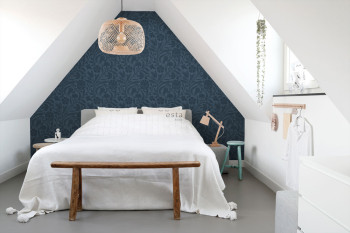 Hladká, temně modrá, vliesová tapeta s květinovým vzorem.