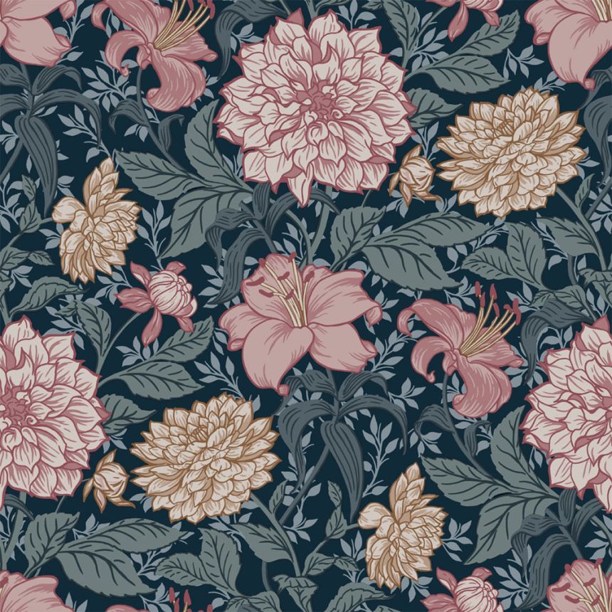 Hladká vliesová tapeta na zeď, bohatý květinový vzor v odstínech modré, starorůžové a hnědé.