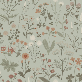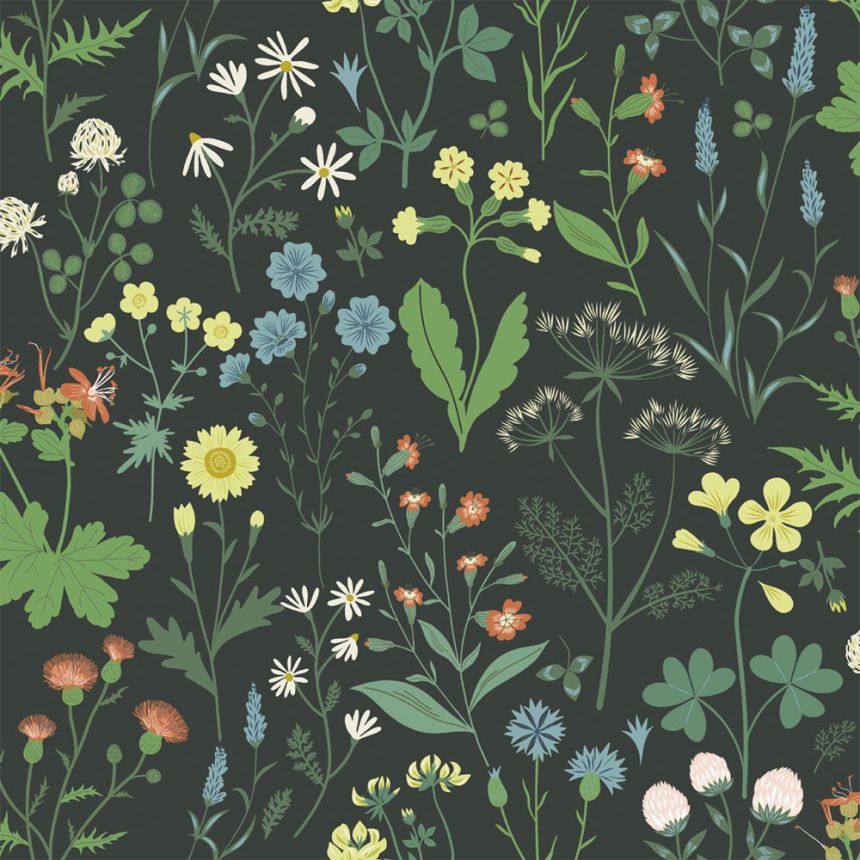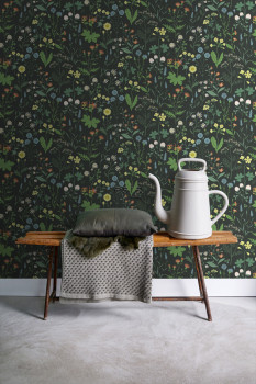 Černá hladká vliesová tapeta na zeď, vzor lučních květin v odstínech zelené, žluté, modré a hnědé.