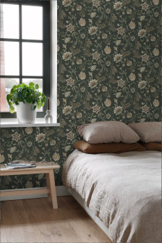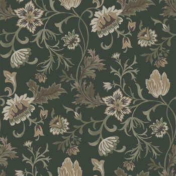 Hladká černá vliesová tapeta na zeď, květinový ornamentální vzor v odstínech šedé a hnědé.