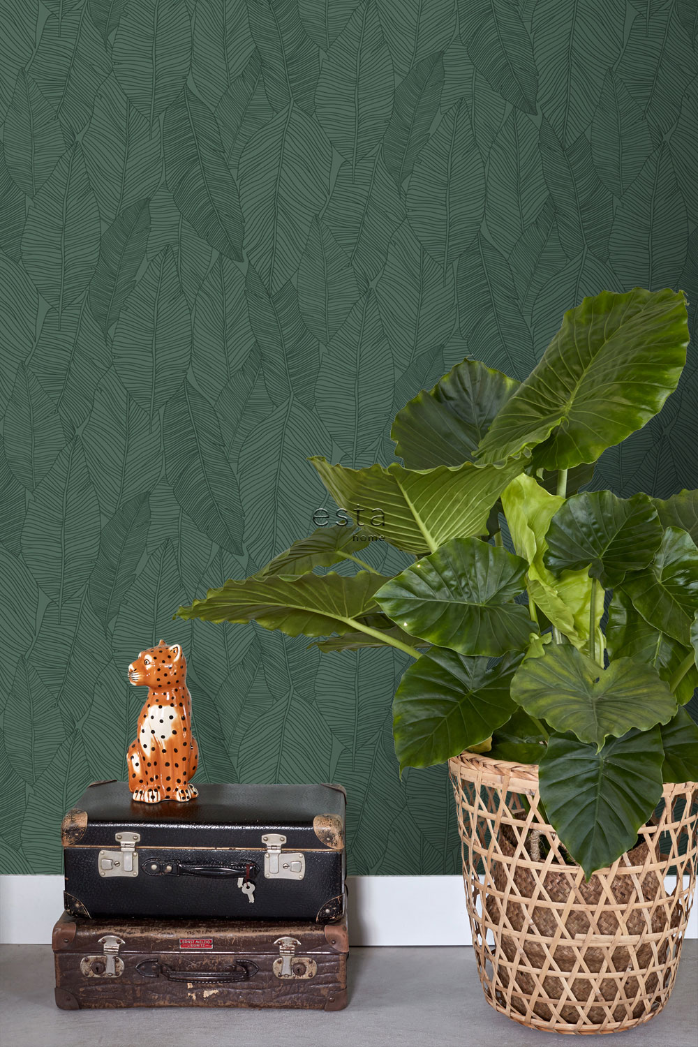 Hladká, zelená, vliesová tapeta na zeď, obrysy listů.