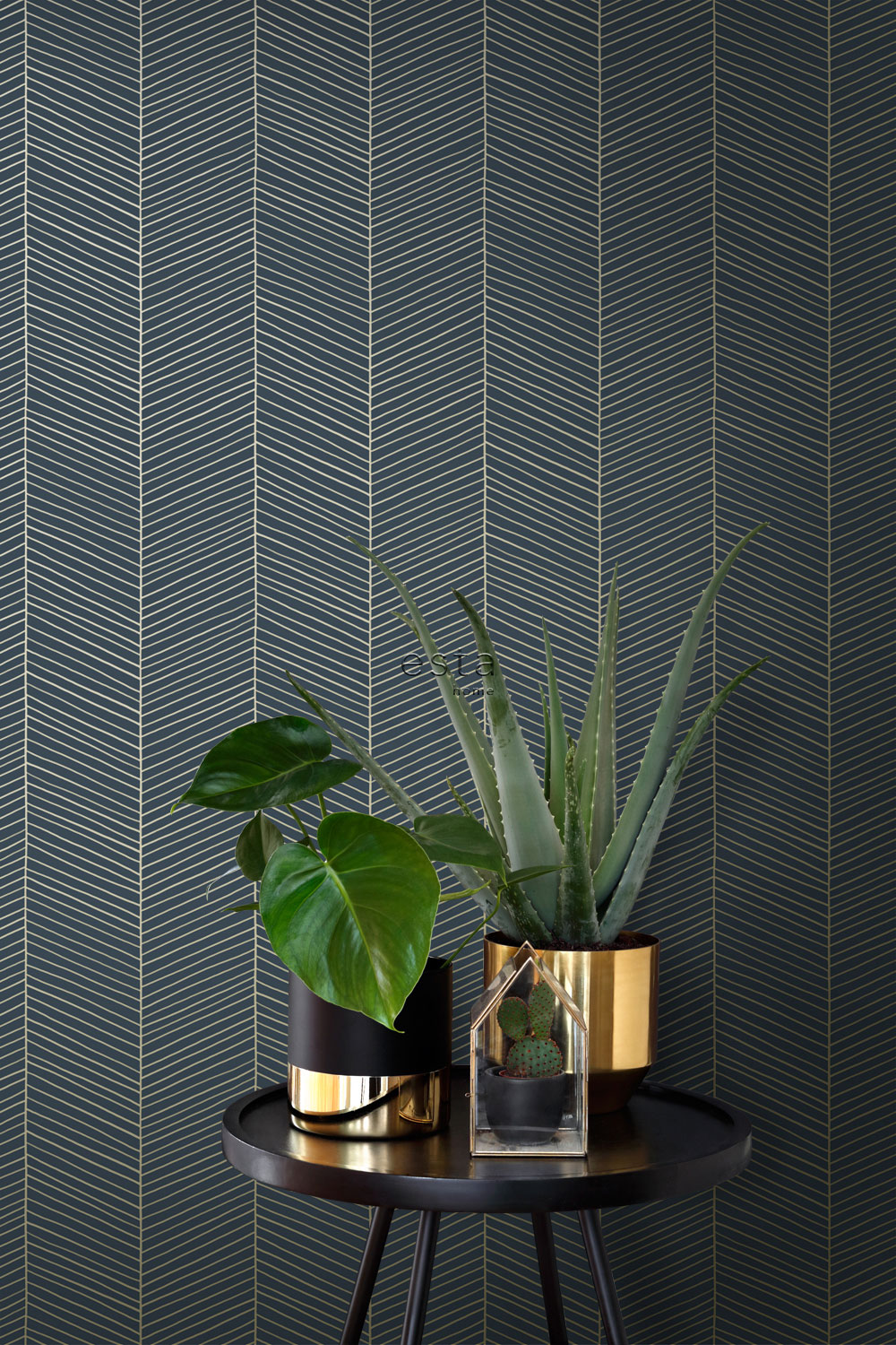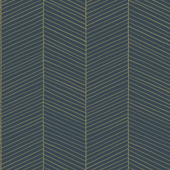Modrá hladká vliesová tapeta s geometrickým vzorem - zlaté linie.