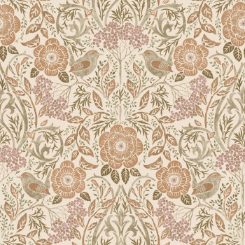 Hladká, světle béžová vliesová tapeta na zeď, bohatý vzor s květinami a ptáčky v odstínech zelené, hnědé a levandulové.