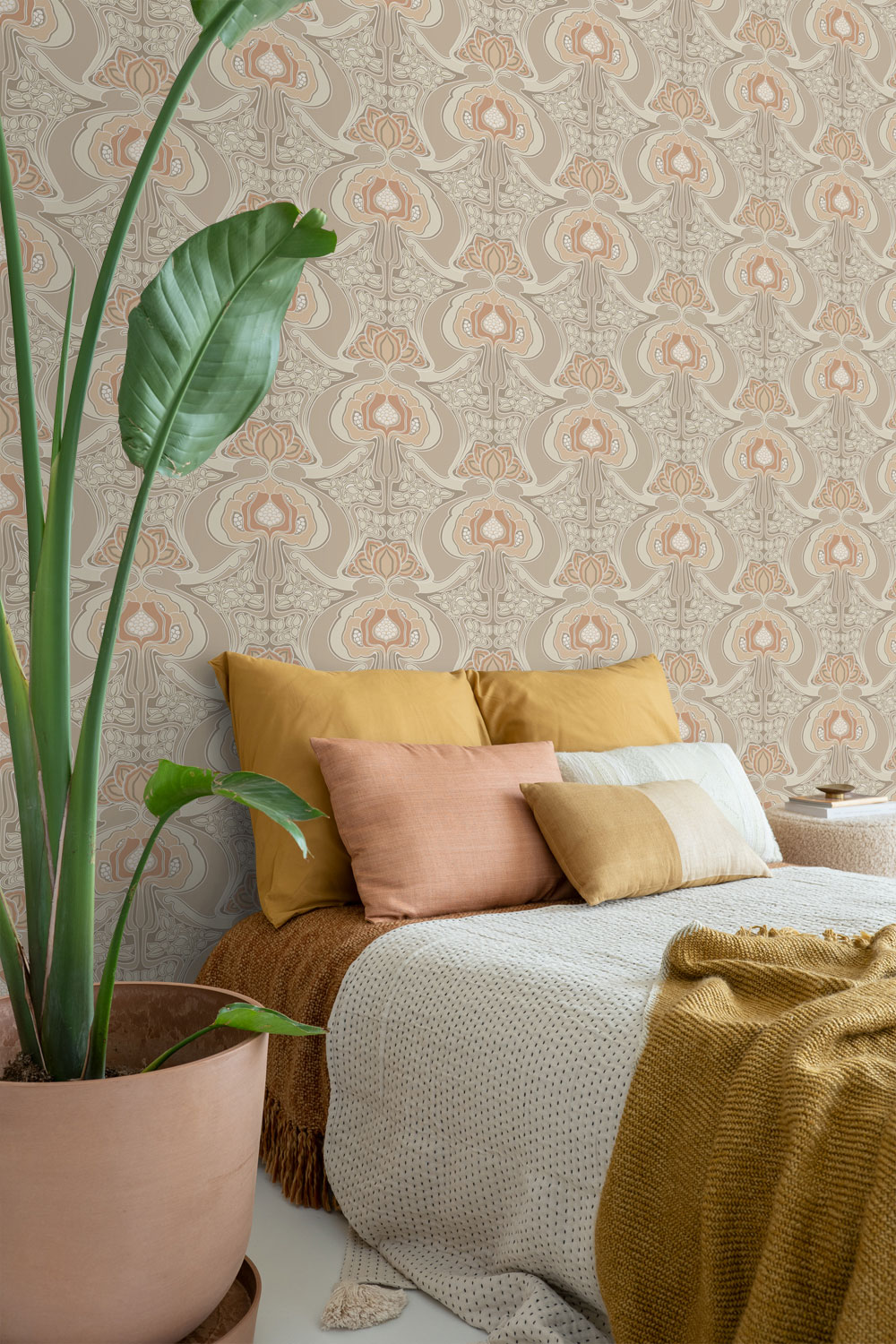 Vliesová tapeta se secesním květinovým vzorem v odstínech béžové a starorůžové.
