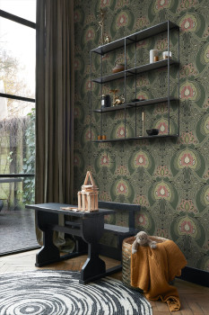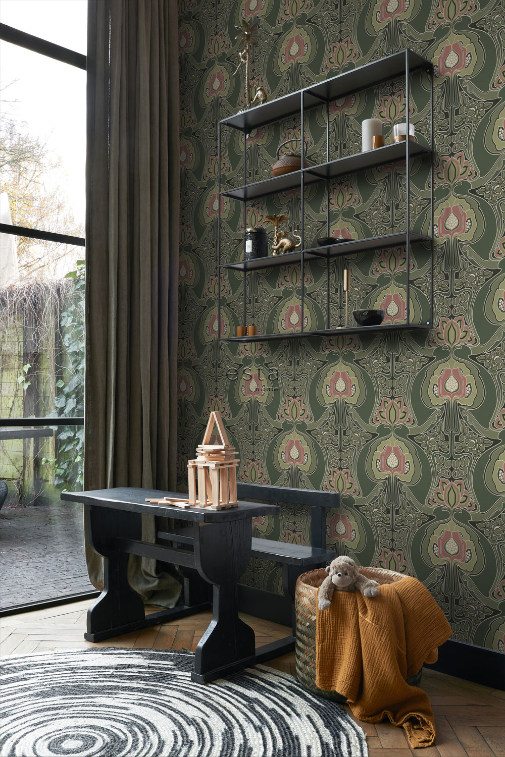 Vliesová tapeta se secesním květinovým vzorem v odstínech zelené a hnědo-růžové.