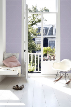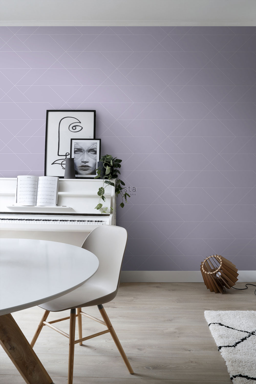 Hladká fialová vliesová tapeta na zeď, bílé linie vytváří geometrické vzory.
