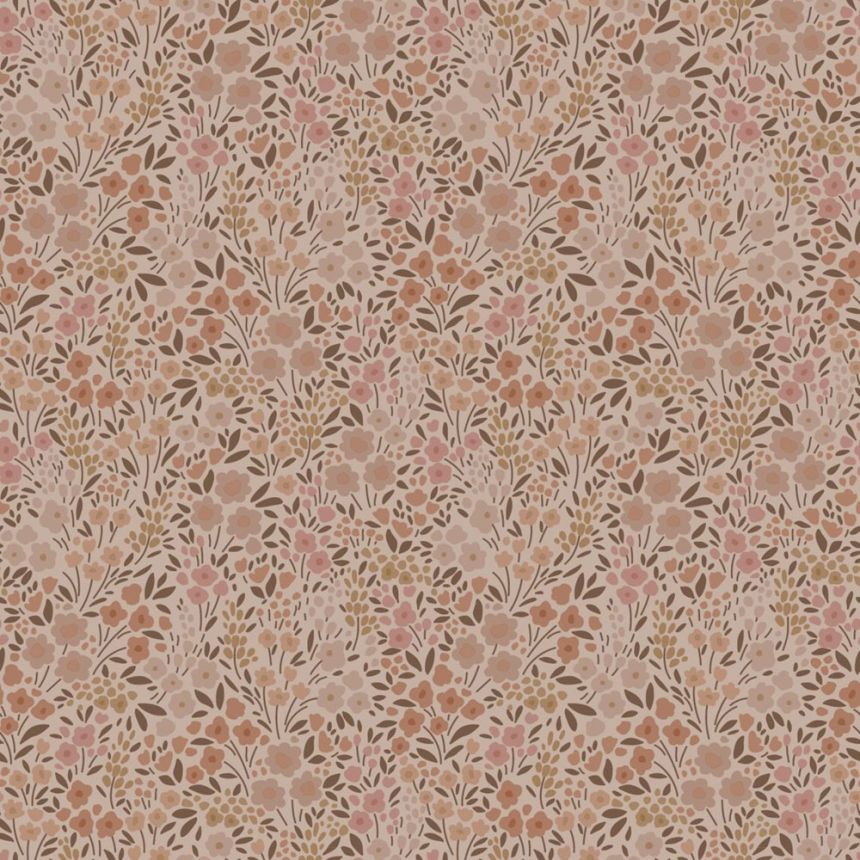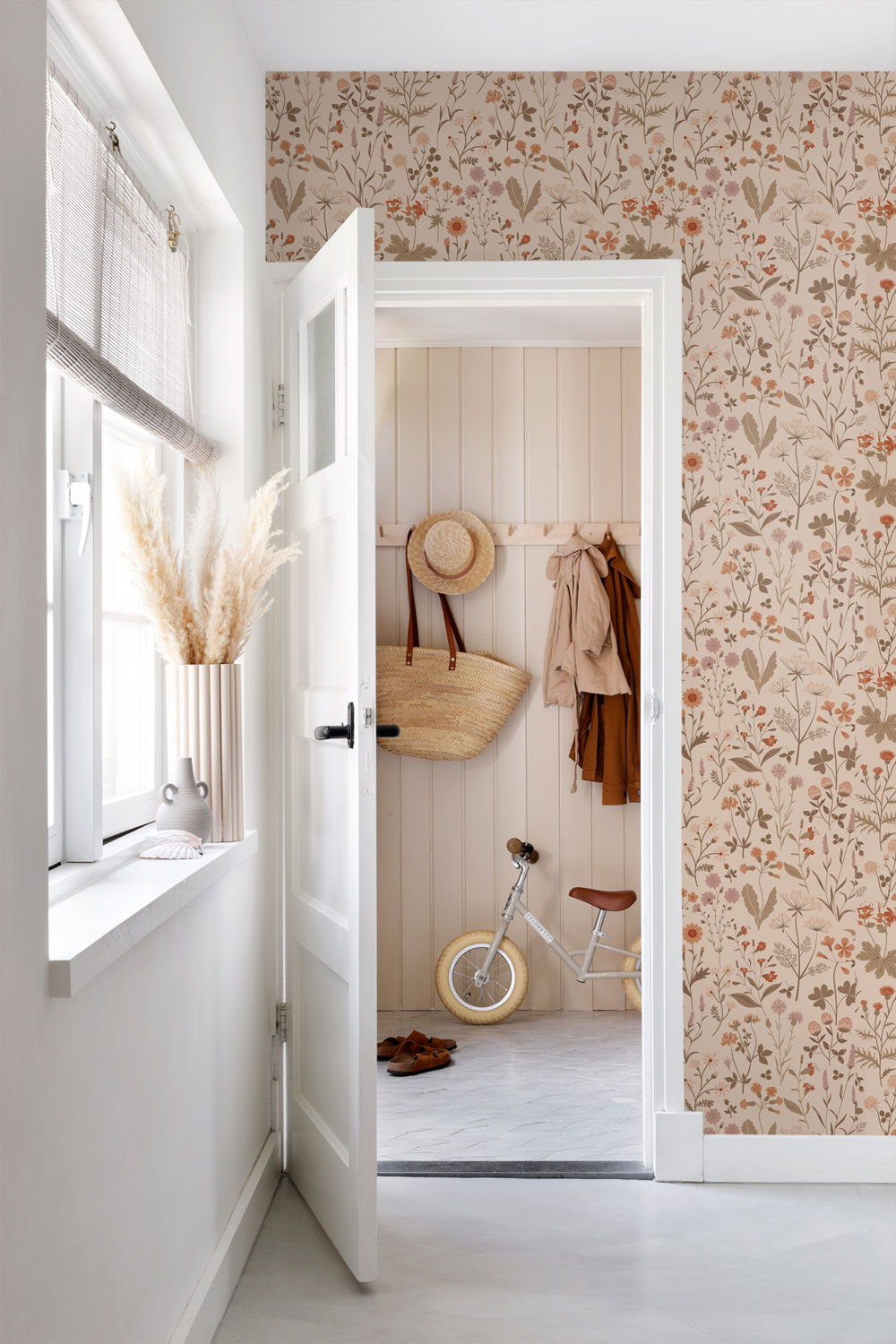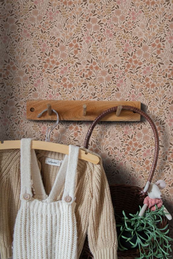 Starorůžová hladká vliesová tapeta na zeď, vzor lučních květin v odstínech zelené, hnědé, šedé a cihlové.