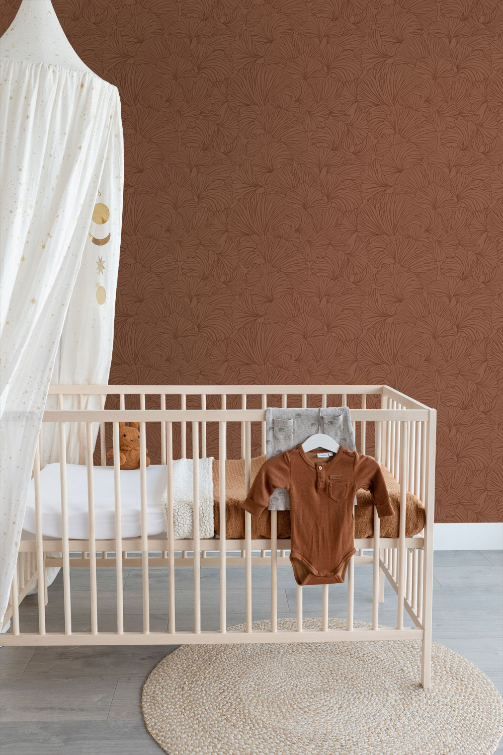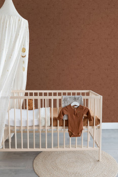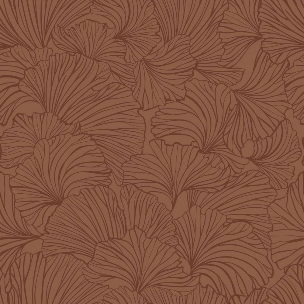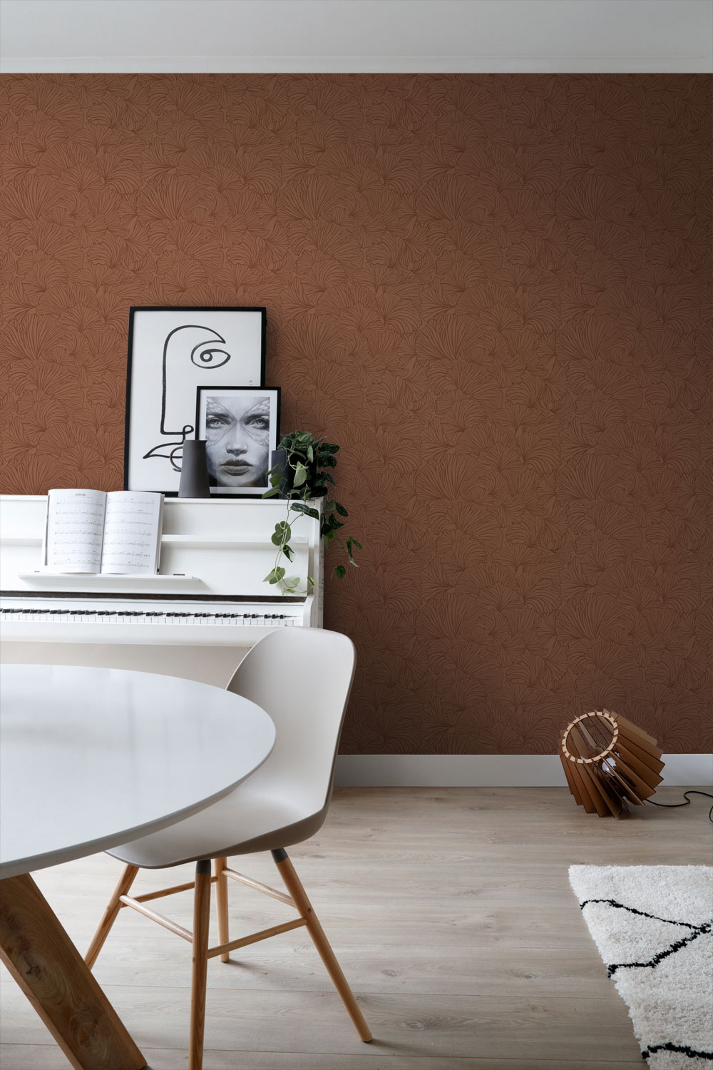 Hladká, hnědá vliesová tapeta na zeď, vzor listů.