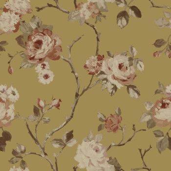 Hladká zlatá vliesová tapeta na zeď, rozkvetlé růže.
