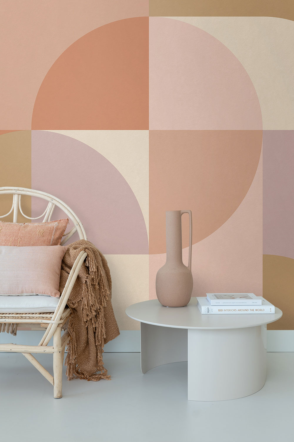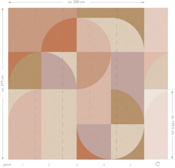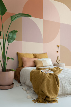 Geometrická vliesová tapeta na zeď, odstíny hnědé, béžové, fialové a růžové.
