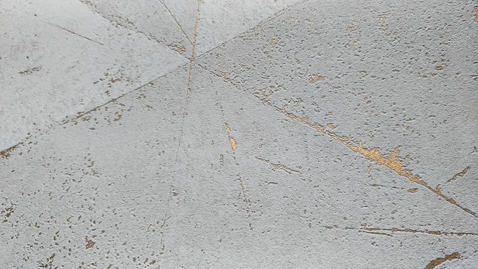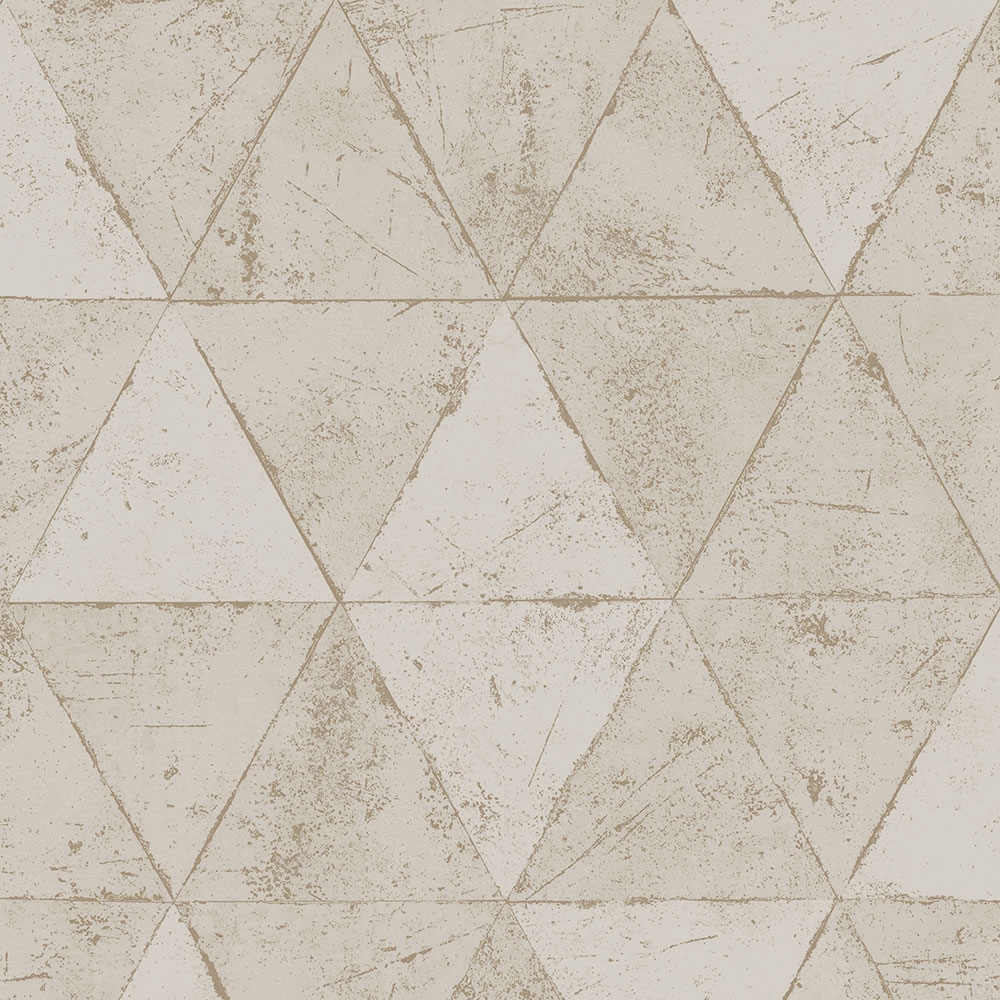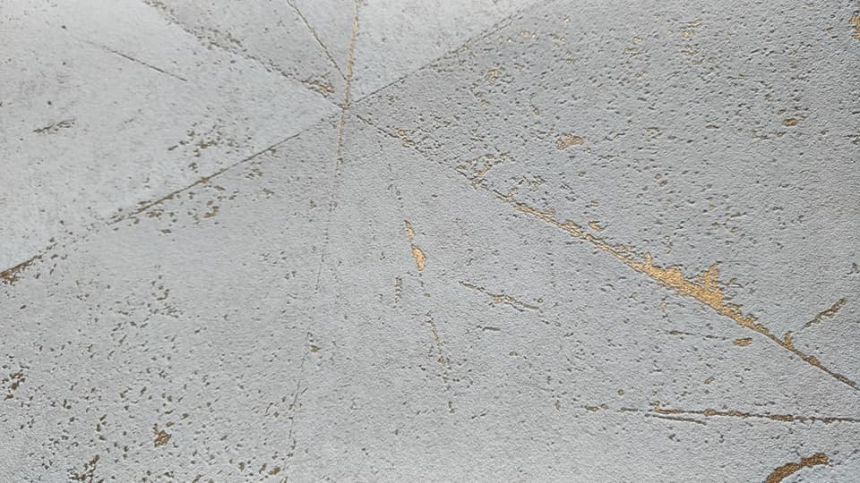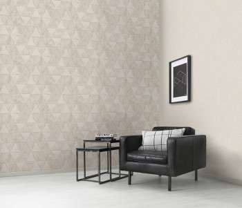 Vliesová tapeta s geometrickým vzorem v odstínech matné šedo-béžové, prosvítající prolisy metalické bronzové.