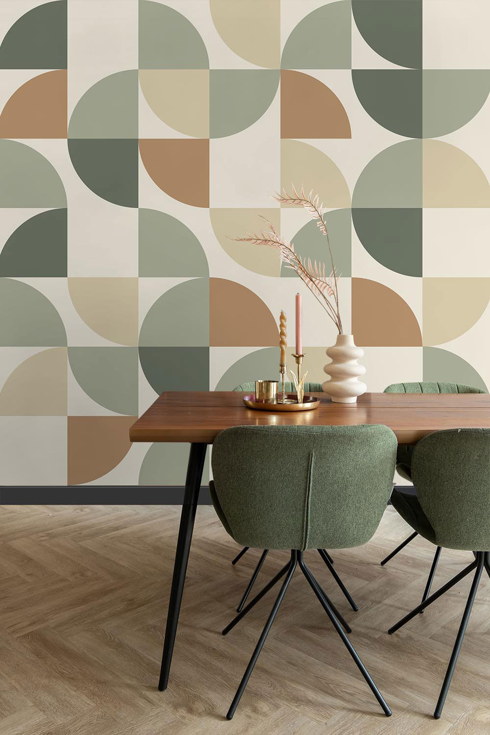 Geometrická vliesová tapeta na zeď, odstíny zelené, béžové, hnědé a černé.