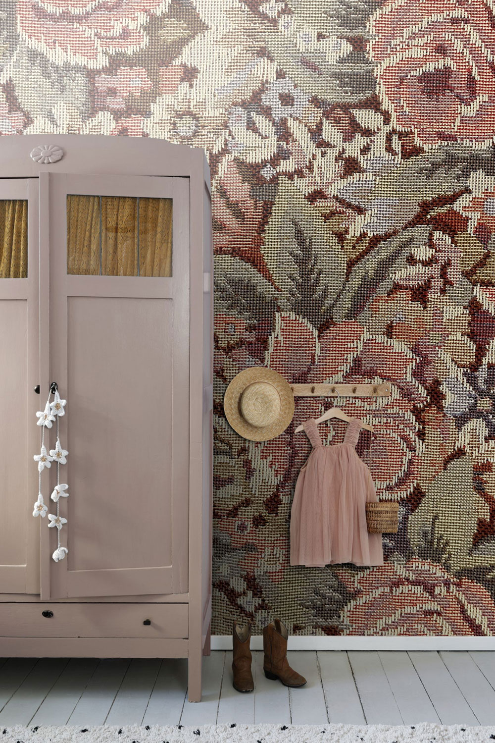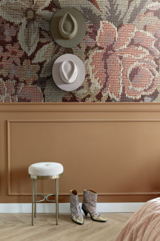 Květinová vliesová tapeta na zeď, odstíny starorůžové, vínové a béžové, vzor evokuje staré tapisérie.
