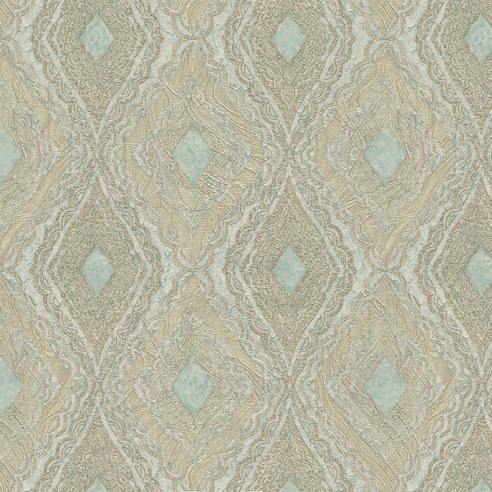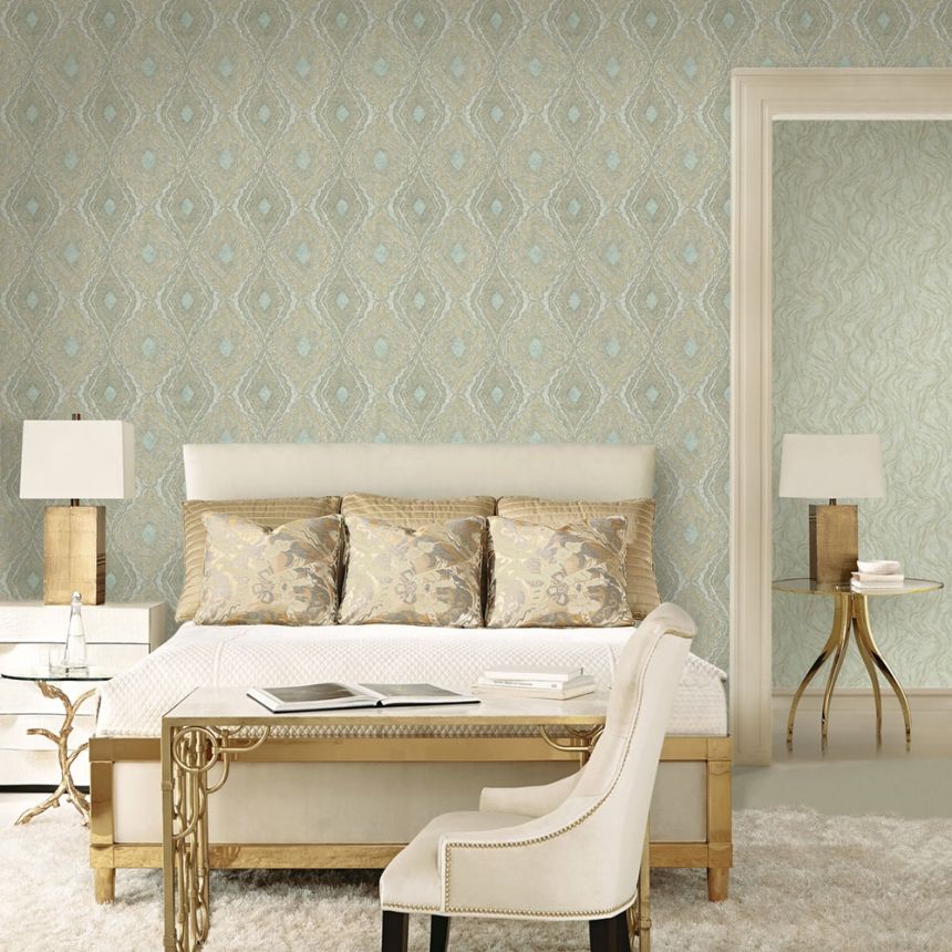 Role šíře 1,06m. Inspirováno přírodou - výrazně plastický mramorovaný design, podklad v jemně metalických odstínech tyrkysové, vzor okrově zlatá. Snadno zkombinujete se souvisejícími vzory.