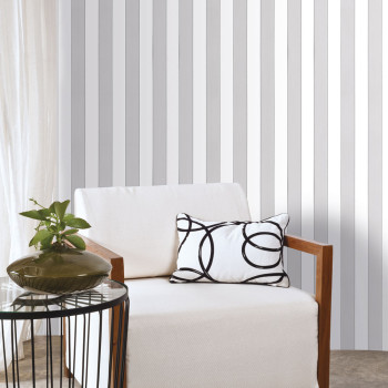 Vliesová tapeta na zeď, šedé a bílé pruhy, úzký černý proužek.