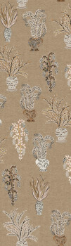 Vliesová tapeta na zeď, hrubší látková textura, motivy rostlin ve vázách, odstíny hnědé, béžové, růžové, šedé.