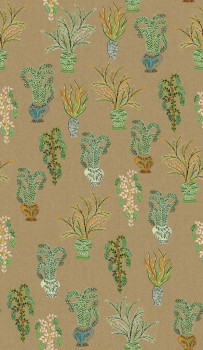 Vliesová tapeta na zeď, hrubší látková textura, motivy rostlin ve vázách, odstíny khaki, hnědé, modré, zelené.