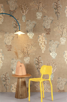 Vliesová tapeta na zeď, hrubší látková textura, motivy rostlin ve vázách, odstíny khaki, hnědé, modré, zelené.