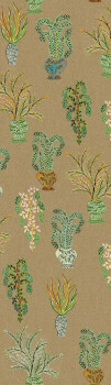 Vliesová tapeta na zeď, hrubší látková textura, motivy rostlin ve vázách, odstíny khaki, hnědé, modré, zelené.
